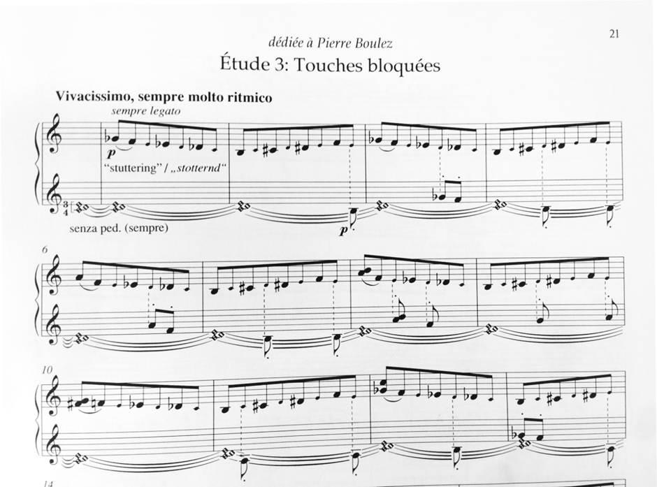 A parallel pianistic realisation of glitch art can be seen in György Ligeti’s Touches bloquées. In this étude, the right-hand start by playing semi-tone runs: