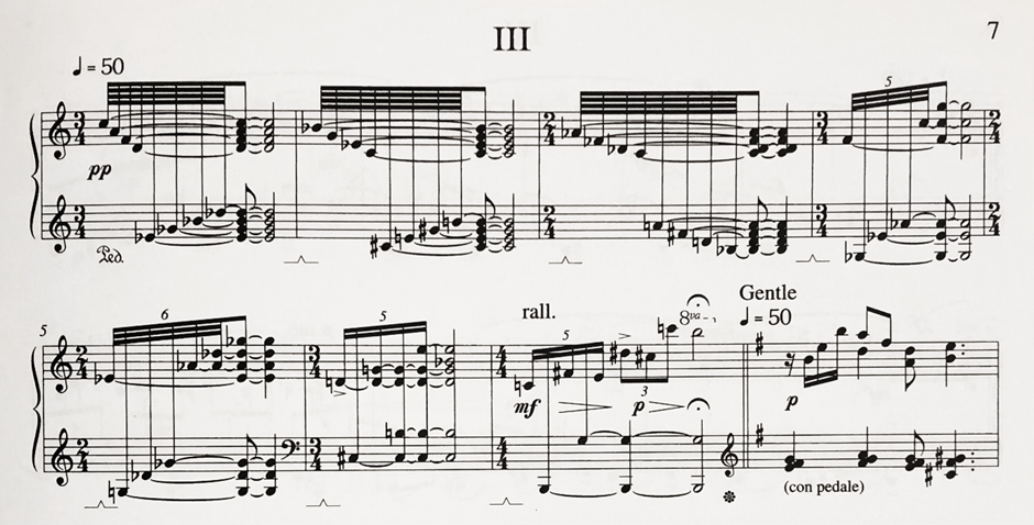 In the third bagatelle from Carl Vine’s Five Bagatelles, the composer crosses the hands in a manner that visually (and sonically) appears as a pianistic equivalent to cross-hatching: