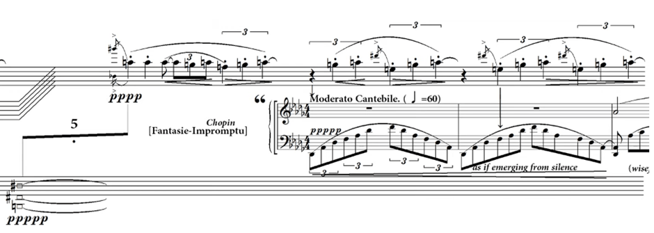 Borrowing material from such sources can stir up emotions quickly as the audience already has a pre-conception of the visual or aural stimulus. Lodge (2003) commented that “new meaning and interpretations must arise from the new contexts in which the quoted material is placed. This is the fundamental premise of all collage techniques…” (p. 39). In George Crumb’s Makrokosmos, the composer successfully works into his score the instantly recognisable slow section from Chopin’s Fantasy Impromptu: